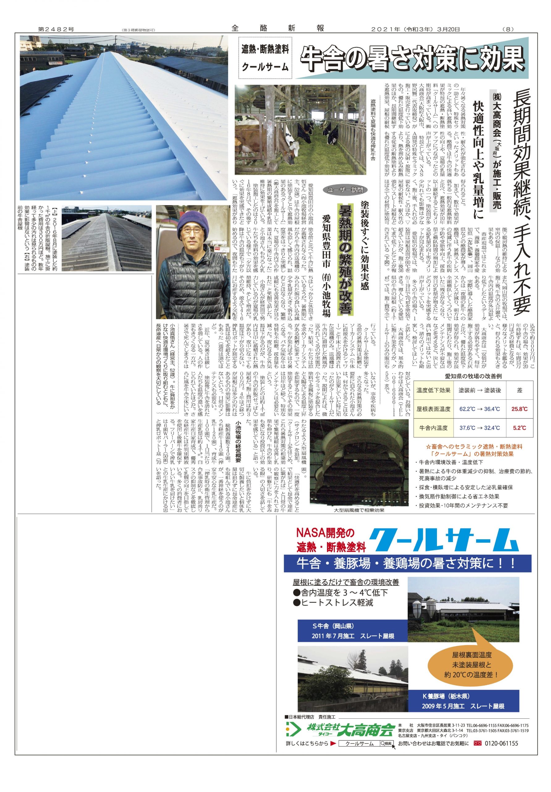 全酪新報2021年3月20日号に掲載頂きました! 2021.06.23 お知らせ 弊社の遮熱・断熱塗料「クールサーム」についての記事を掲載頂きました。 畜産現場などの暑さ対策を御検討の方は是非お問合せ下さいませ。 前の記事へ次の記事へ お知らせ一覧に戻る