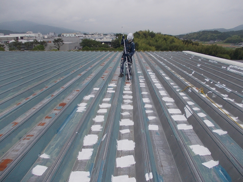 今回は滋賀工場様の工場棟屋根にクールサームを塗装させていただきました。