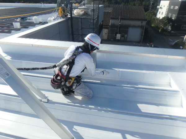 今回、三重工場様の事務所棟の屋根に遮熱・断熱塗料「クールサーム」を塗装させていただきました。