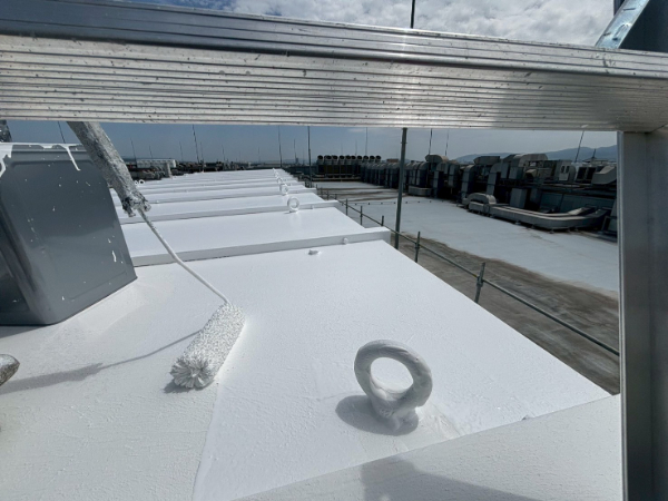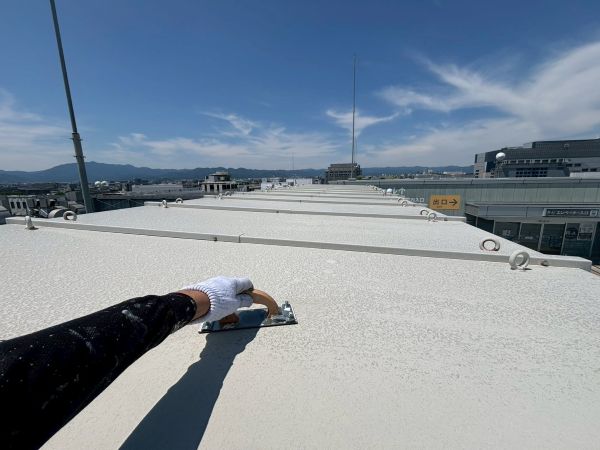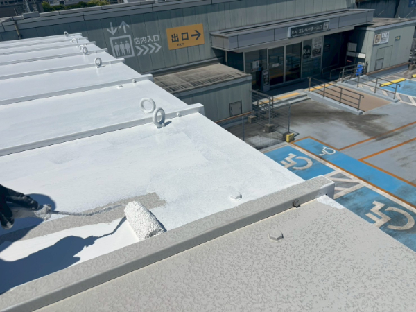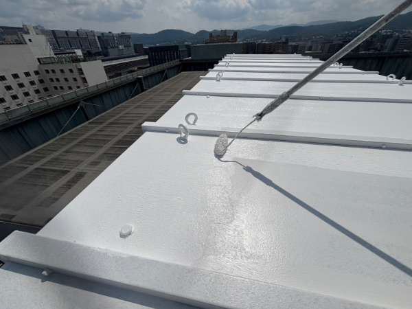 遮熱塗料「クールサーム」を工場・倉庫・事務所などの屋根に施工することで、夏場の強い日射を反射し、屋根表面温度の上昇を抑えます。